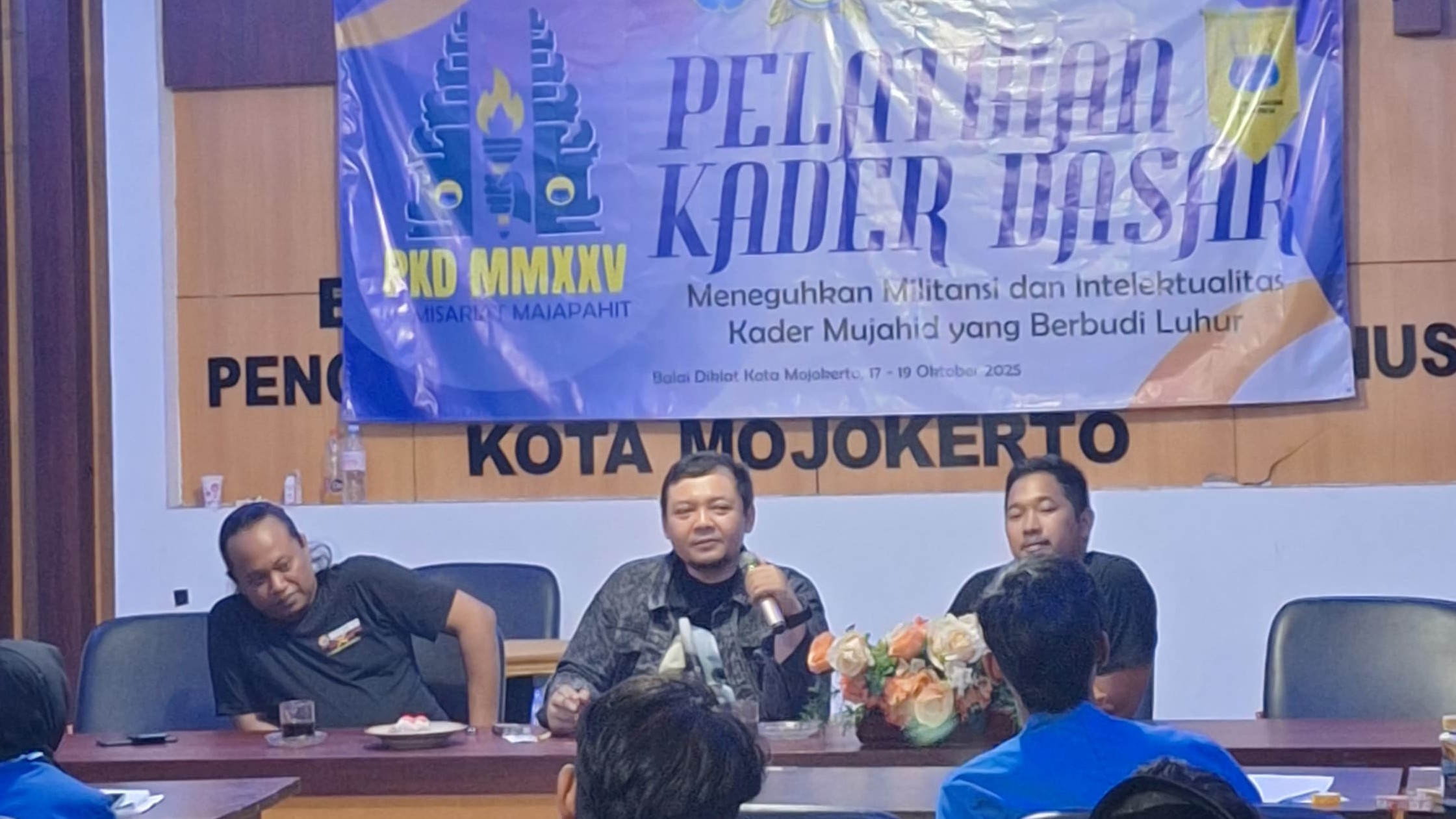 KOTA MOJOKERTO — Wakil Wali Kota Mojokerto Dr. Rachman Sidharta Arisandi, S.IP., M.Si. (Cak Sandi) mendorong organisasi kader bergerak melampaui pola reaktif menuju organisasi berbasis fungsi saat membuka Pelatihan Kader Dasar (PKD) PMII Komisariat Majapahit di Balai Diklat Kota Mojokerto.