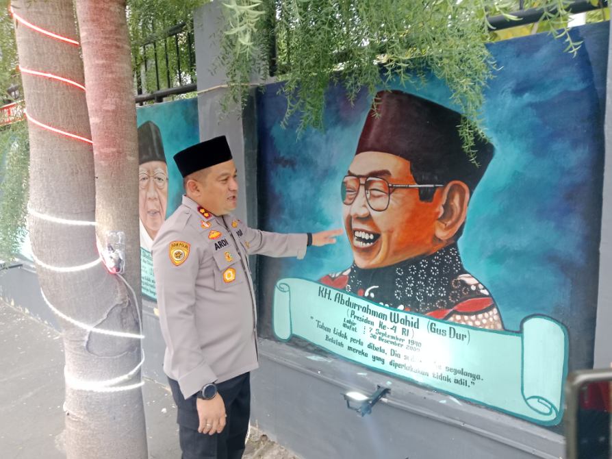 JOMBANG : Kapolres Jombang, AKBP Ardi Kurniawan, menegaskan pentingnya mewarisi dan meneladani nilai-nilai luhur yang diperjuangkan oleh para guru bangsa yang berasal dari Kabupaten Jombang. Hal ini disampaikan terkait keberadaan mural tokoh-tokoh nasional asal Jombang, termasuk KH Abdurrahman Wahid (Gus Dur), yang terpampang di Mapolres Jombang.