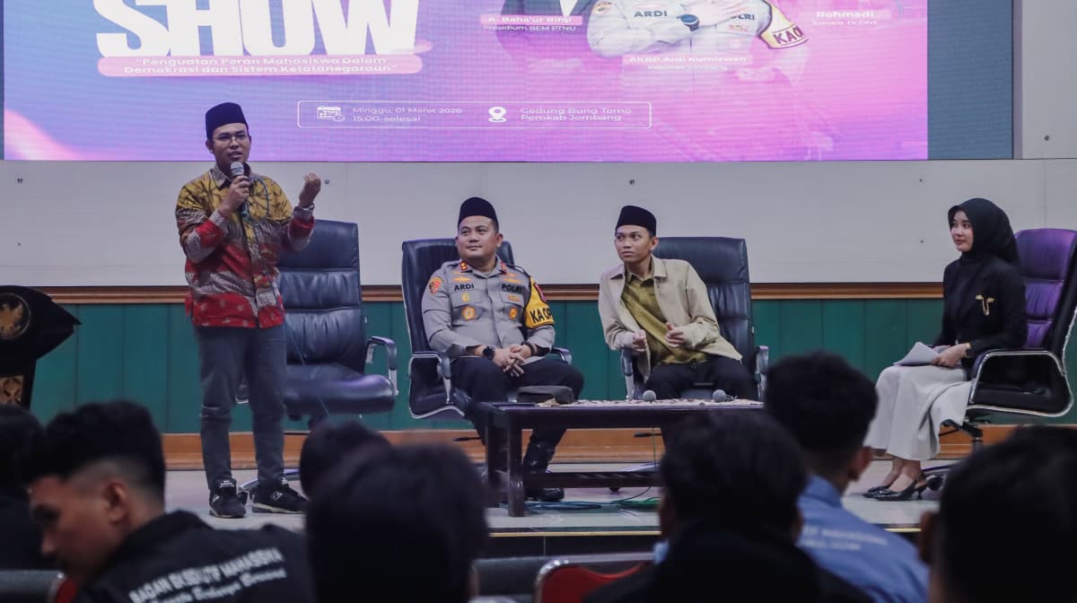 JOMBANG – Di tengah gempuran teknologi kecerdasan buatan (AI) dan riuhnya isu viral di media sosial, mahasiswa dituntut tidak sekadar menjadi penonton atau terjebak dalam arus Fear of Missing Out (FOMO). Pesan menohok ini disampaikan oleh Ketua DPD Komite Nasional Pemuda Indonesia (KNPI) Kabupaten Jombang, Rohmadi, dalam Forum Talk Show bertajuk “Penguatan Peran Mahasiswa dalam Demokrasi dan Sistem Ketatanegaraan” yang digelar oleh Ikatan Badan Eksekutif Mahasiswa Kabupaten Jombang (IKABEMJO) di Aula Bung Tomo Pemkab Jombang, Minggu (1/3/2026) petang.